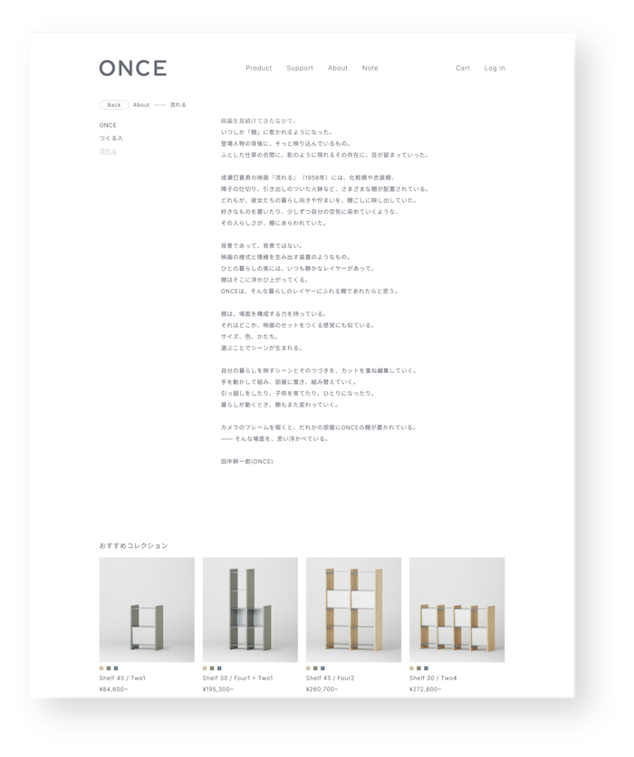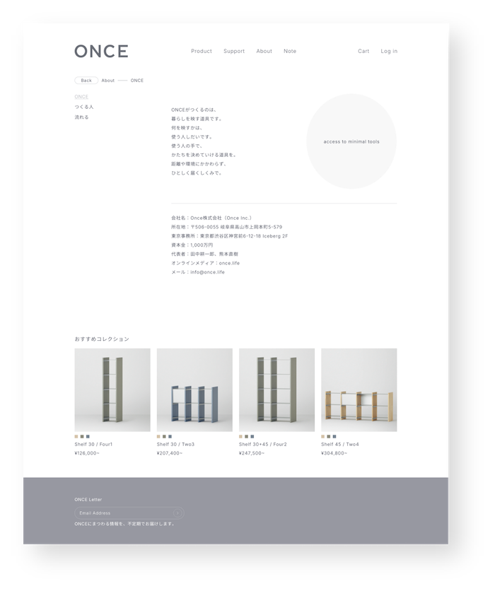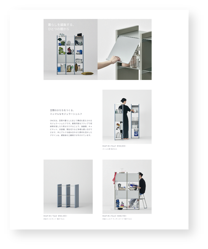 インテリアのシェルフを中心に、機能性とデザイン性を兼ね備えたプロダクトを展開する Once株式会社。暮らしの中に自然と溶け込み、空間の可能性を広げるインテリアを提案しています。ロゾパンサンは、ONCE公式ECサイトの改修において、Shopifyを活用したEC構築およびサイト構造の再設計を担当しました。